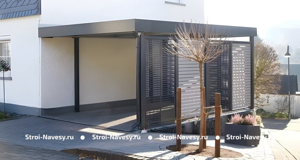 Односкатный навес-пристройка «хай-тек» из профнастила с закрытыми боковыми панелями