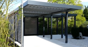 Современный односкатный навес high-tech из профлиста для двух машин
